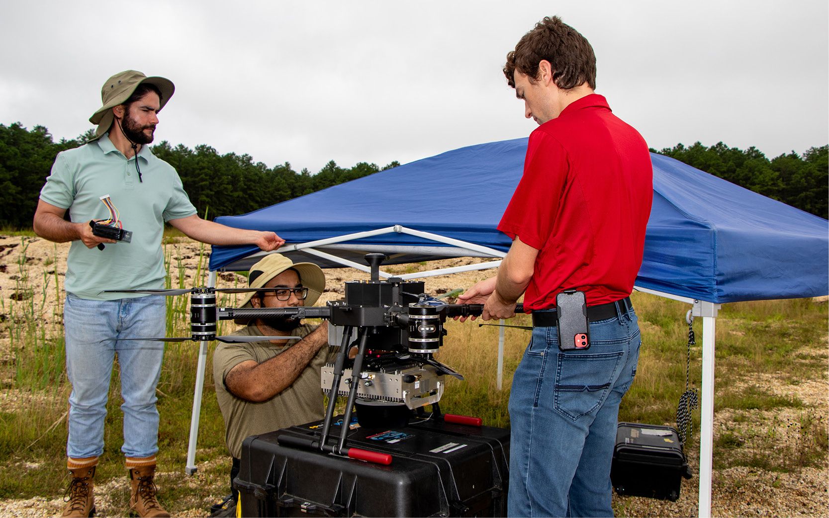 (From left) Kevin Honsaker, Tamoor Hamid and Jon Platt prepare a SOAR system for flight. The box attached to the drone’s underside contains a 5G wireless module, and an APL-designed antenna is below the module. Credit: U.S. Army/Dan Lafontaine